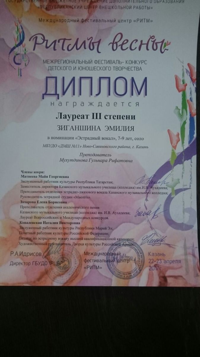 6Зиганшина Эмилия Лауреат III степени "Ритмы весны"