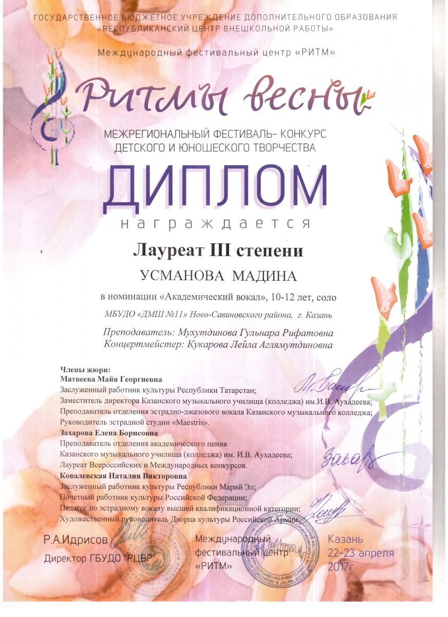 15 Усманова Мадина Лауреат III степени "Ритмы весны"