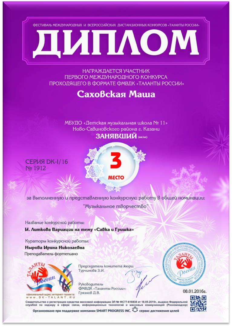 1 Шушкова Полина, дипломант 3 степени, Содружество талантов
