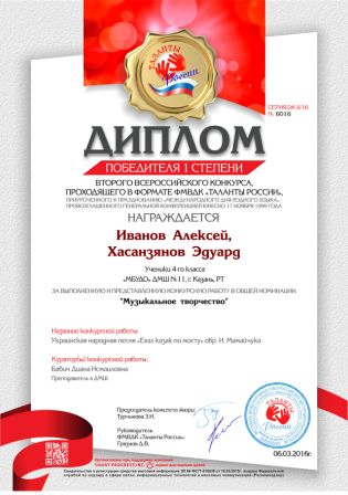 9 дуэт Иванов , Хасанзянов Диплом победителя I степени Таланты России