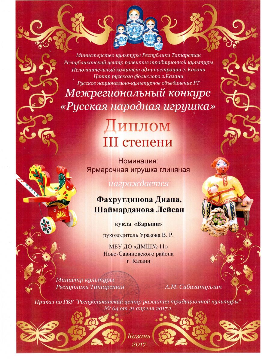 42 Фахрутдинова Диана, Шаймарданова Лейсан "Русская народная игрушка" Диплом III место