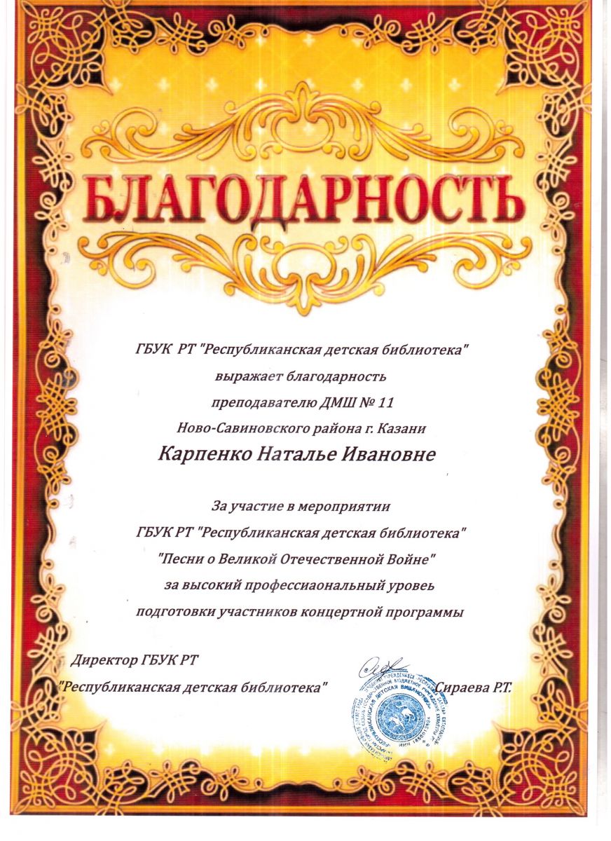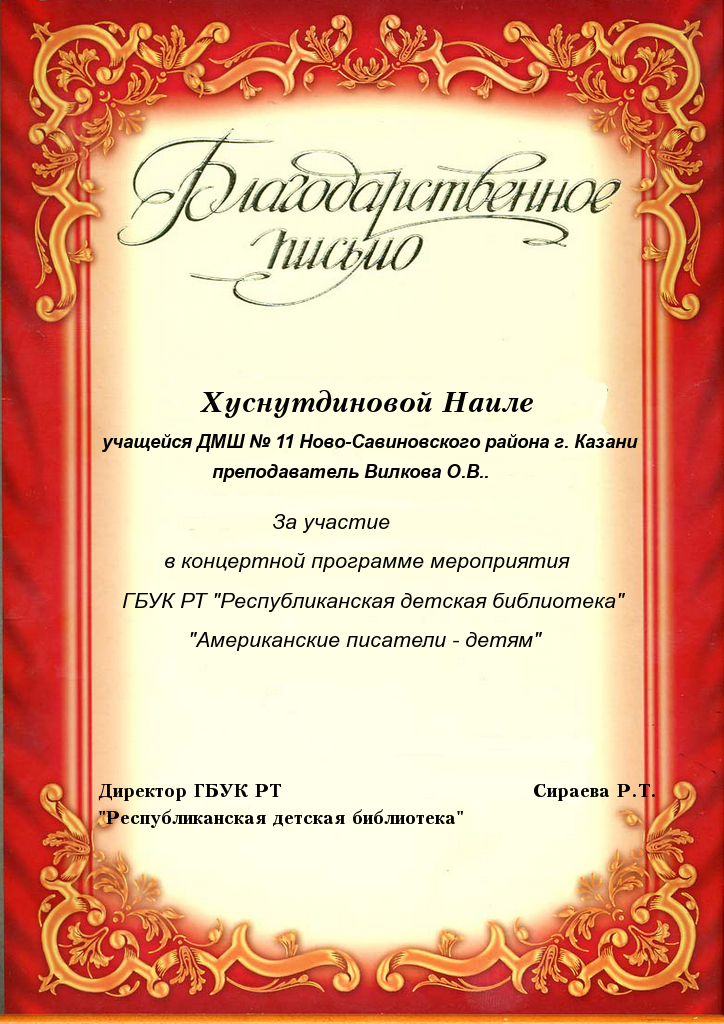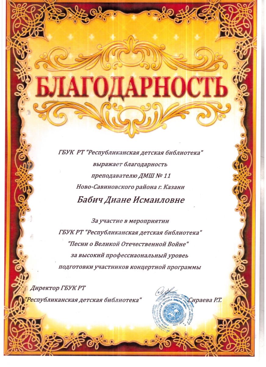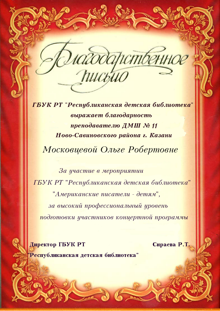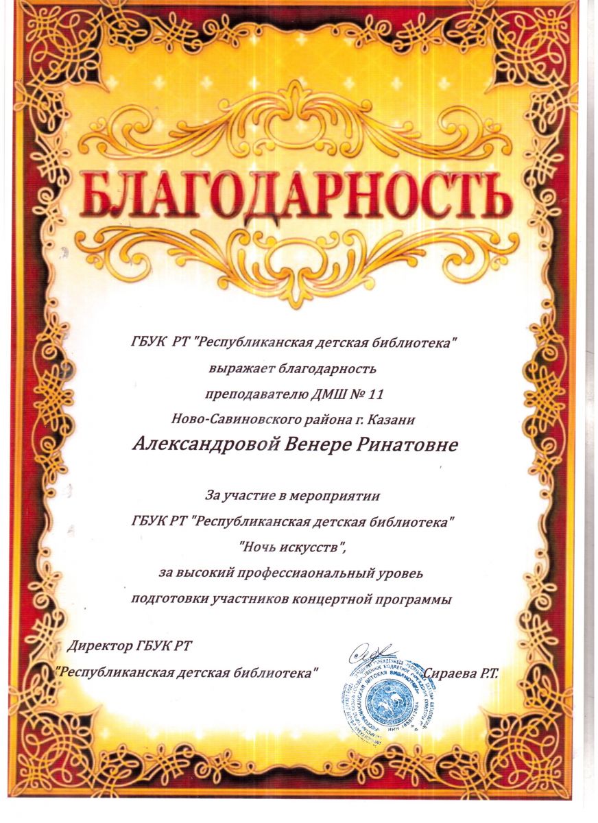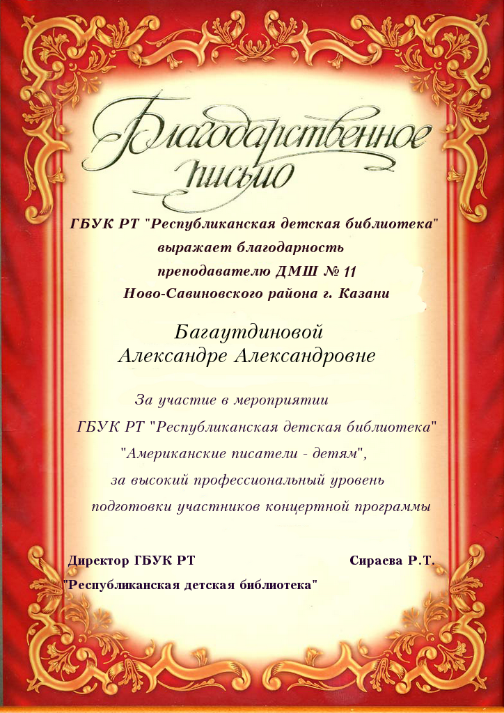 Благодарность ГБУК "Республиканская детская библиотека" Александровой В.Р., Кибардиной Н.М., Носовой В.О., Ходжаевой Л.Р.