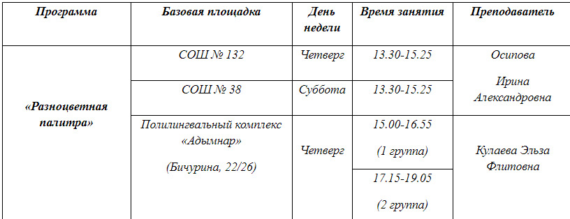 Расписание "Разноцветная палитра" на базе ГАОУ "Адымнар-Казань" и СОШ 132, 38 2020-2021 учебный год