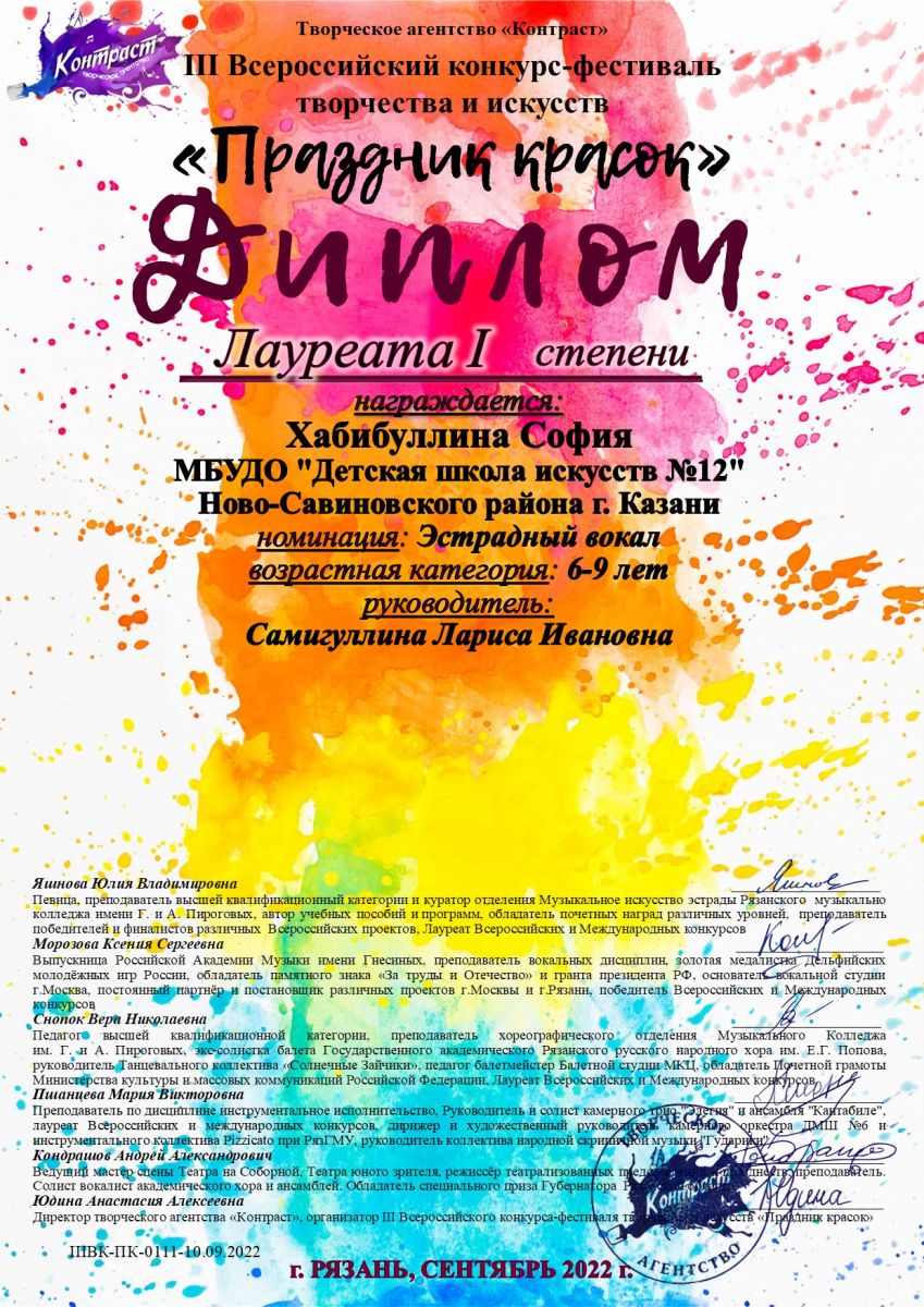 - Хабибуллину Софию - Лауреата 1 степени (преподаватель Самигуллина Л.И.). Номинация эстрадный вокал. Возрастная категория 6-9 лет.