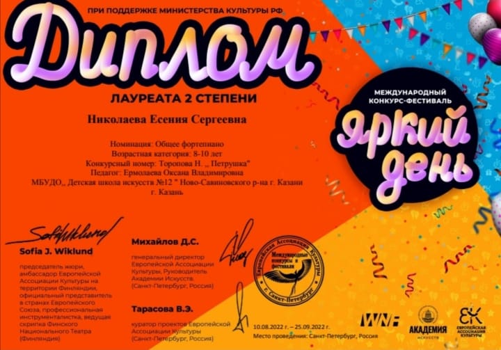 - Николаеву Ксению - Лауреата 2 степени (преподаватель Ермолаева О.В.). Номинация: Инструментальное исполнительство. Общее фортепиано. Возрастная категория 8-10 лет.