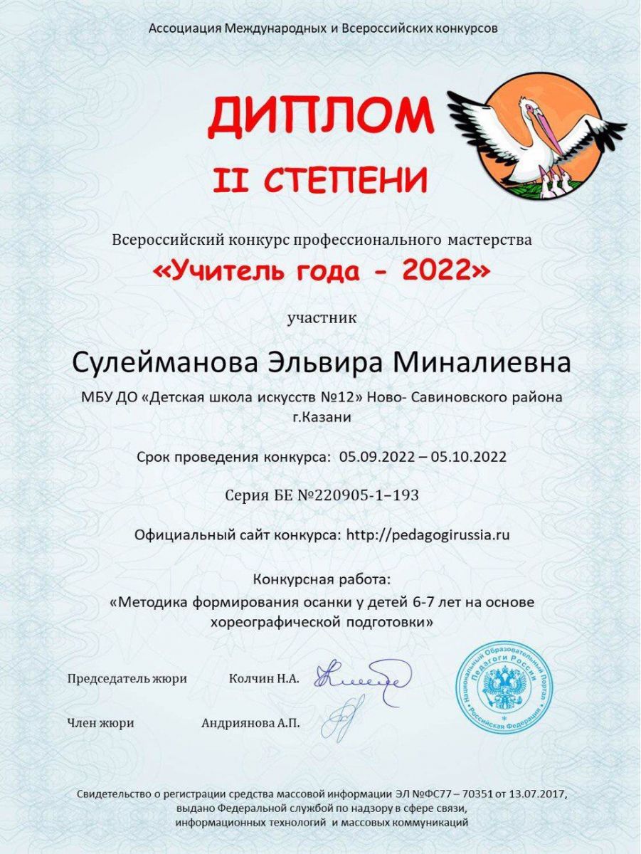 Поздравляем Сулейманову Эльвиру Миналиевну, преподавателя хореографии "ДШИ №12", с победой на Всероссийском конкурсе профессионального мастерства "Учитель года - 2022"!.