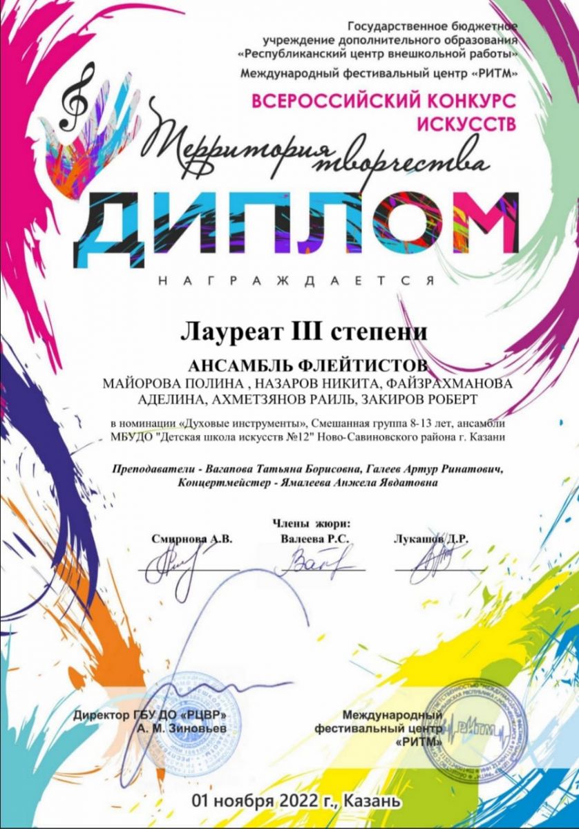 - ансамбль флейтистов: Майорову Полину, Назарова Никиту, Файзрахманову Аделину, Ахметзянова Раиля Закирова Роберта - Лауреатов 3 степени ( преподаватели Вагапова Т.Б., Галеев А.Р., концертмейстер Ямалеева А.Я.) в номинации "Духовые инструменты", смешанная группа 8-13 лет.