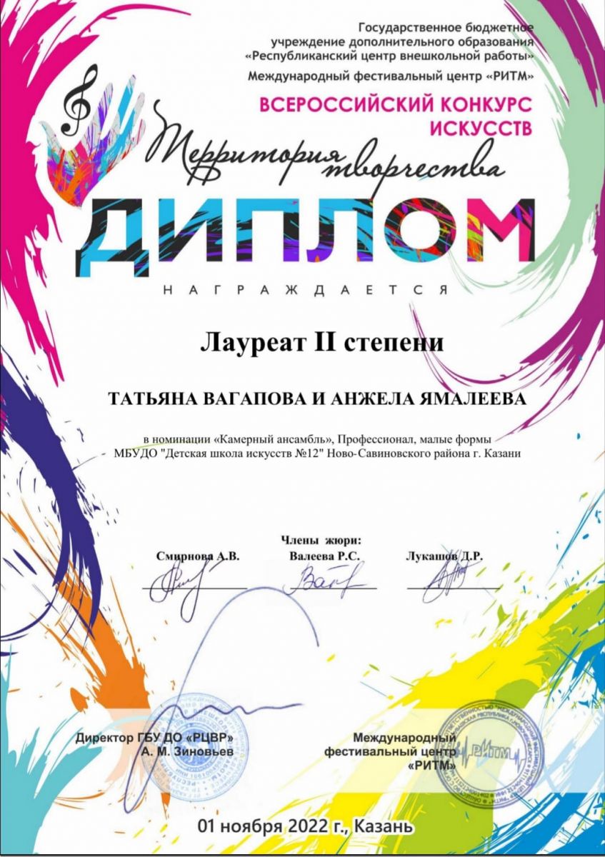 - преподавателя Самигуллину Ларису Ивановну, концертмейстера Ямалееву Анжелу Явдатовну - Лауреатов 1 степени. Номинация Инструментальное исполнительство, общее фортепиано. Возрастная категория: более 40 лет.