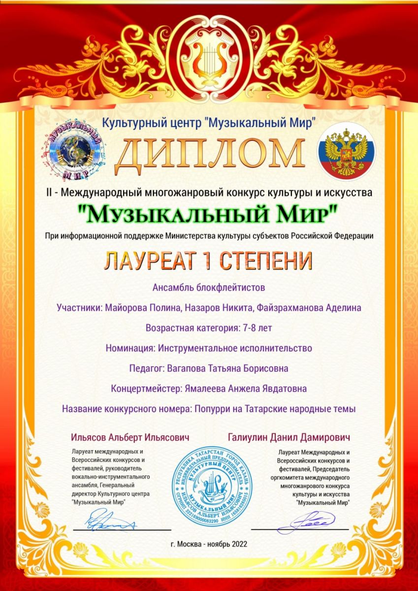 - Ансамбль блокфлейтистов: Майорову Полину, Назарова Никиту, Файзрахманову Аделину - Лауреатов 1 степени. (преподаватель Вагапова Т.Б., концертмейстер Ямалеева А.Я.)