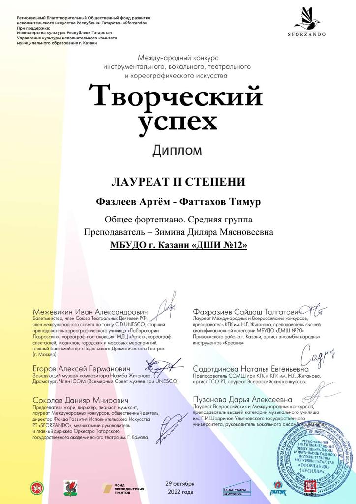 - Фазлеева Артема и Фаттахова Тимура - Лауреатов 2 степени. (преподаватель Зимина Д.М.) Общее фортепиано. Средняя группа.