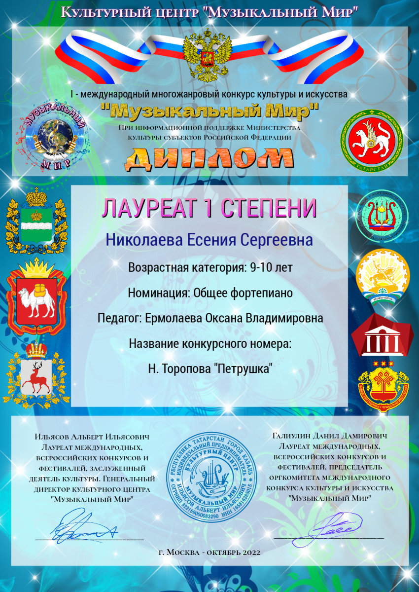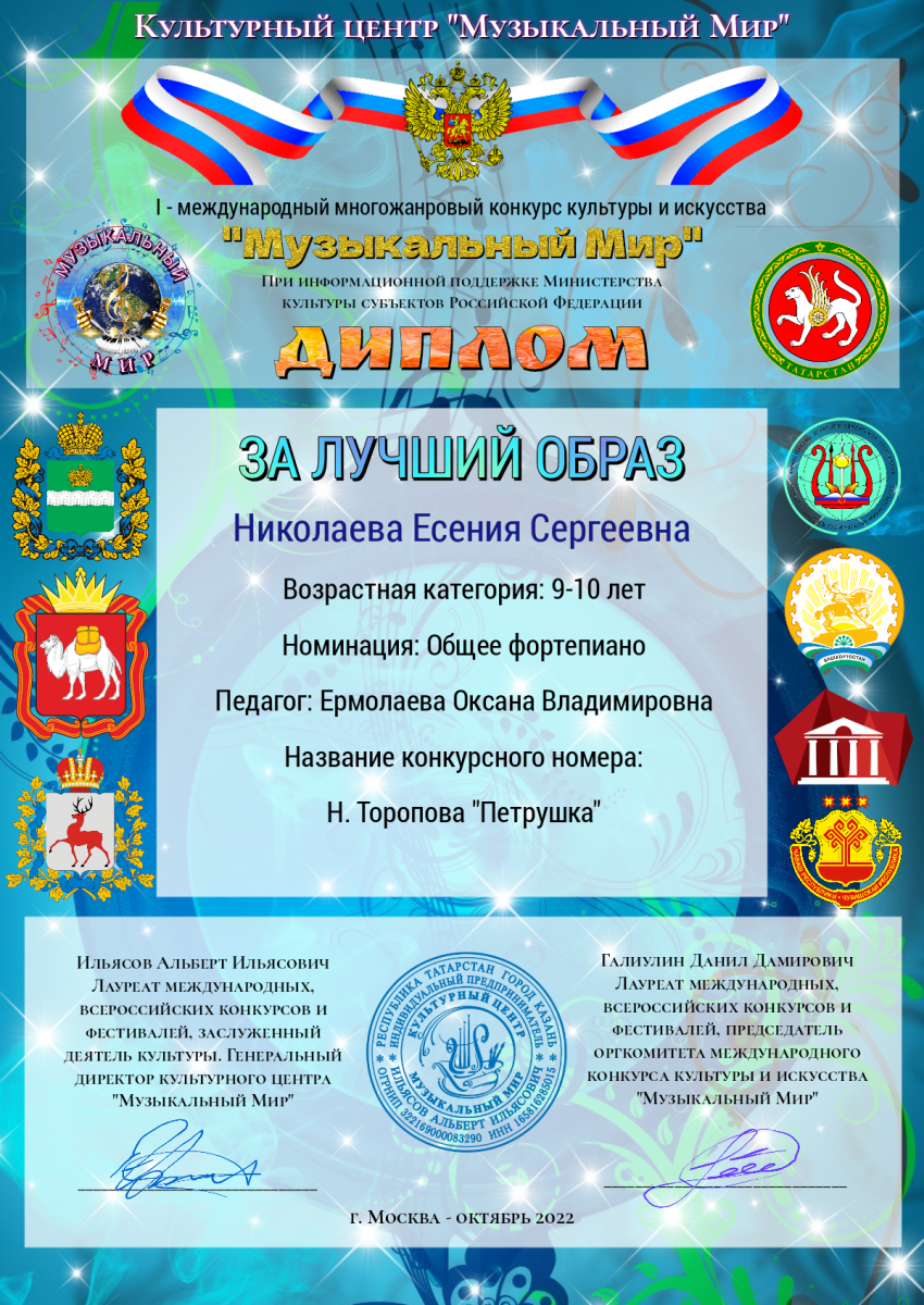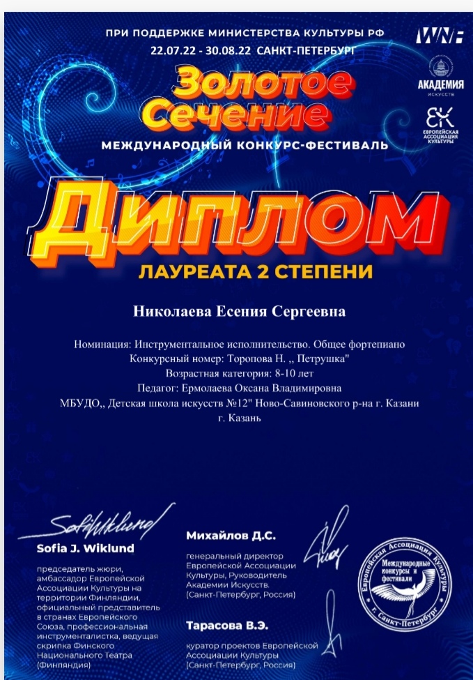 - Николаеву Есению - Лауреата 1 степени (преподаватель Ермолаева О.В.) Номинация: Общее фортепиано. Возрастная категория 9-10 лет. Есения так же получила диплом за Лучший образ.
