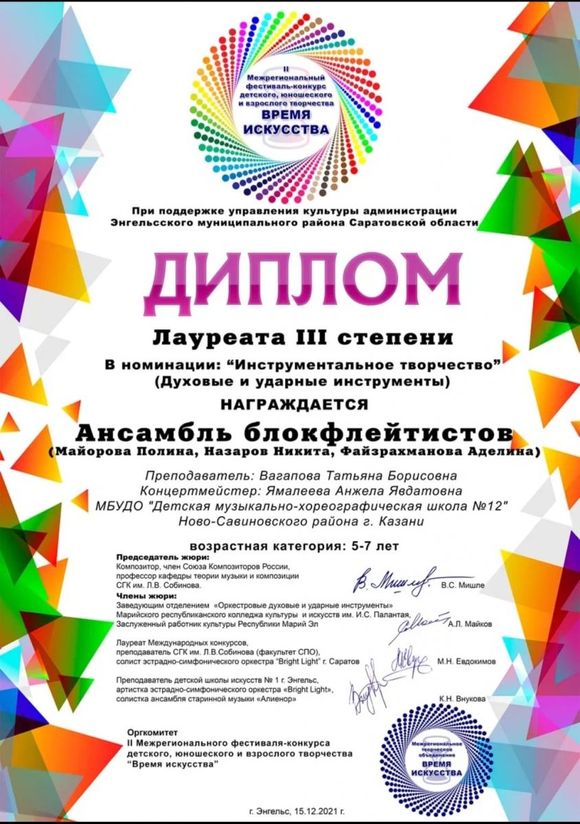 - Ансамбль блокфлейтистов ( Майорову Полину, Назарова Никиту, Файзрахманову Аделину) - Лауреатов III степени ( преподаватель Вагапова Т.Б., концертмейстер Ямалеева А.Я.)