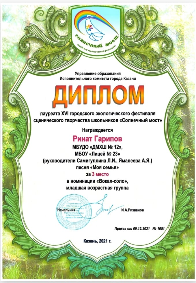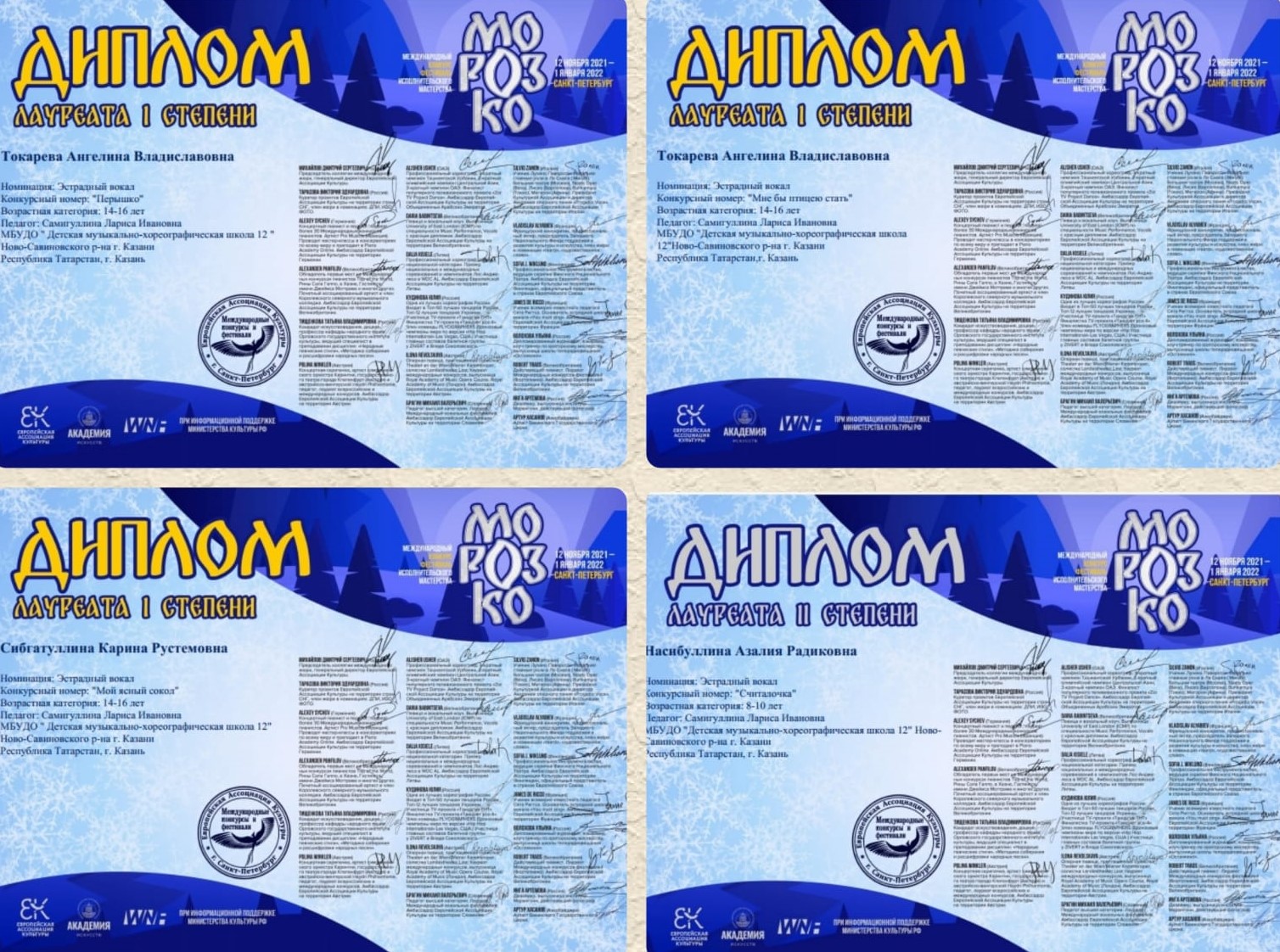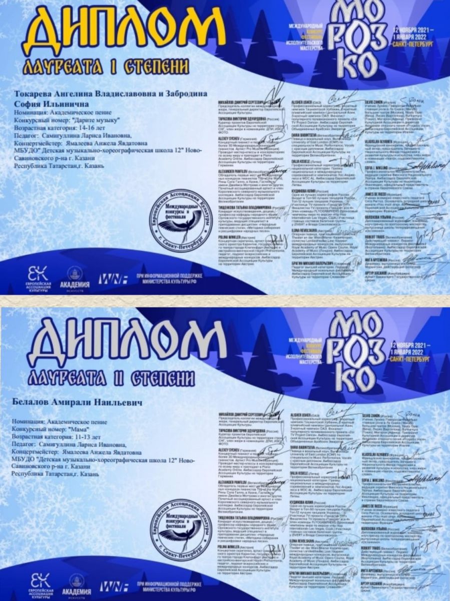 - Младший хор - Лауреатов 3 степени (преподаватель Самигуллина Л.И., концертмейстер Ямалеева А.Я)