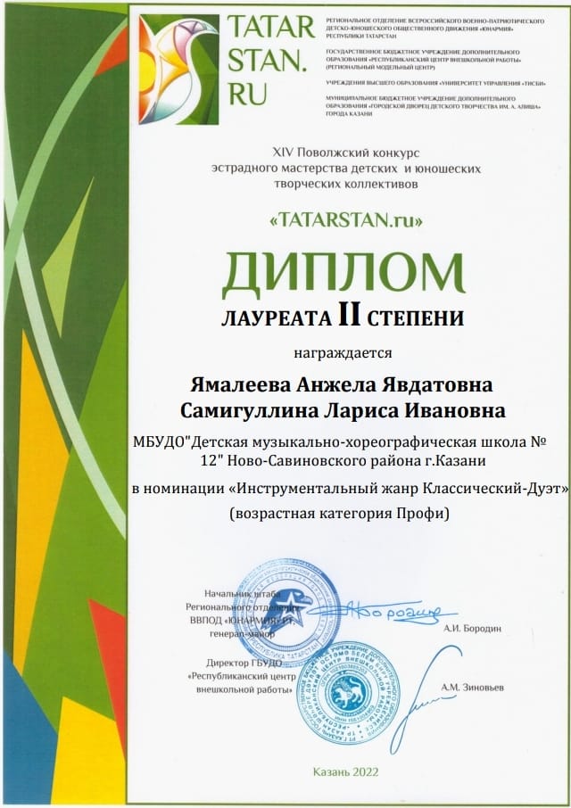 - Дуэт Токаревой Ангелины и Забродиной Софии - Лауреатов 1 степени (преподаватель Самигуллина Л.И.)