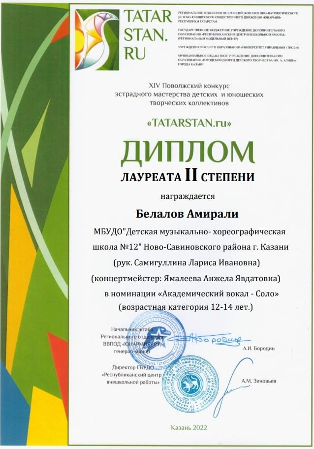 - Белалова Амирали - Лауреата 1 степени (преподаватель Самигуллина Л.И, концертмейстер Ямалеева А.Я.)