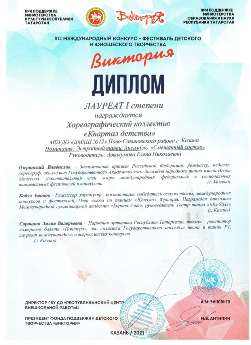 - Хореографический коллектив "Квартал детства" - Лауреатов 1 степени (преподаватель Аввакумова Е.Н.), Номинация: Эстрадный танец, Ансамбль. "Смешанный состав"