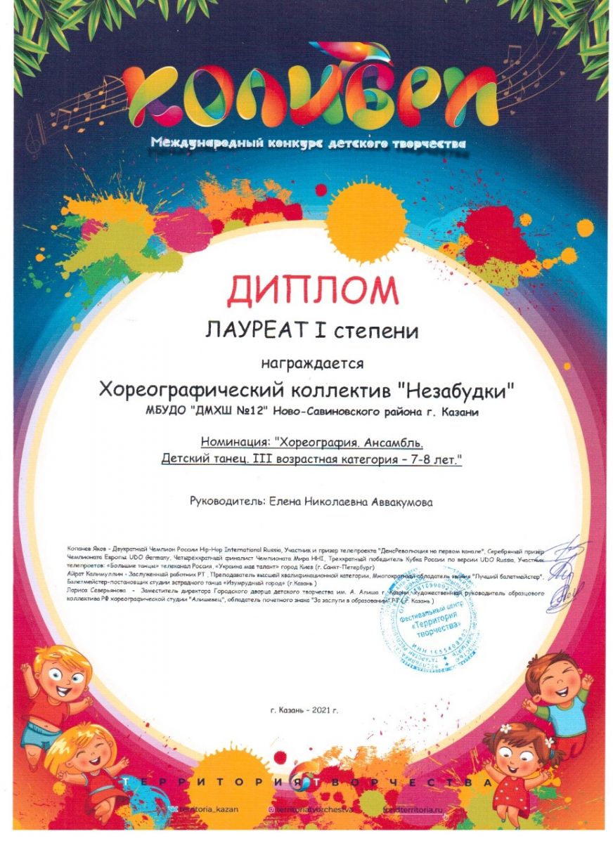 - Хореографический коллектив "Незабудки" - Лауреатов 1 степени (преподаватель Аввакумова Е.Н.), номинация "Хореография. Ансамбль. Детский танец. 3 возростная группа - 7-8 лет.