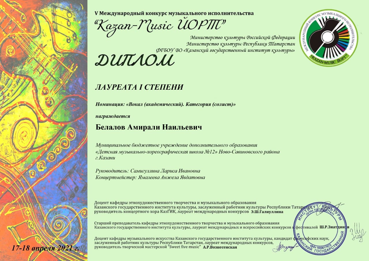 -Белалова Амирали - Лауреата 1 степени (преподаватель Самигуллина Л. И., концертмейстер Ямалеева А. Я.)