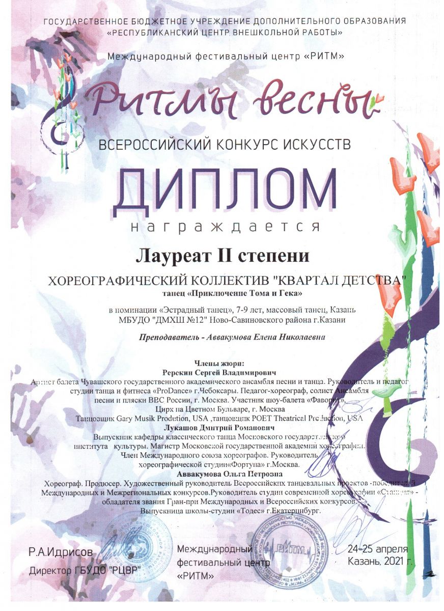 - Хореографический коллектив "Квартал детства" - Лауреатов 2 степени (преподаватель Аввакумова Е.Н.), номинация "Эстрадный танец", 7-9 лет