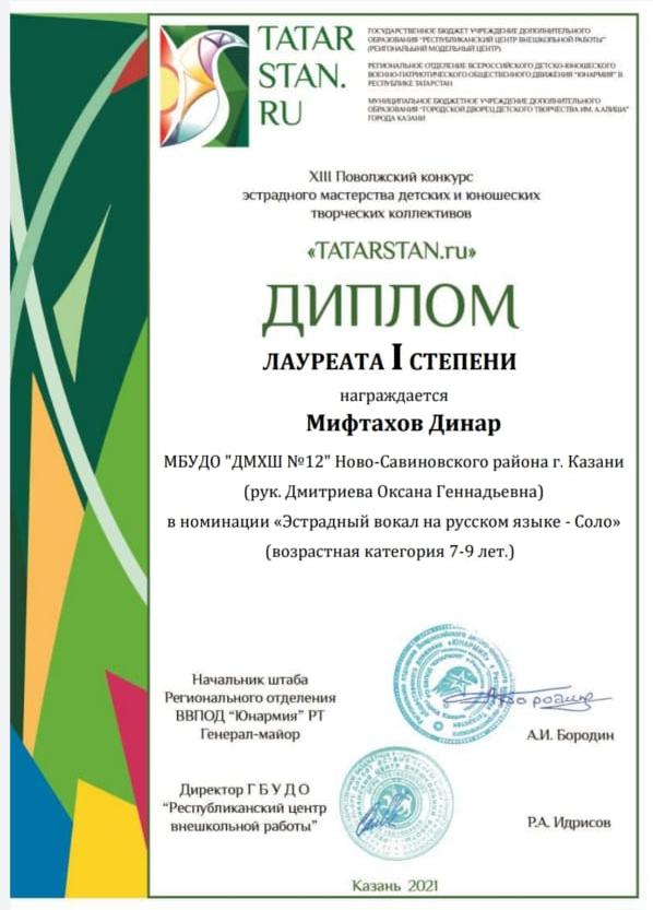 - Мифтахова Динара -Лауреата 1 степени (преподаватель Дмитриева О.Г.) в номинации "Эстрадный вокал на русском языке - Соло", 7-9 лет