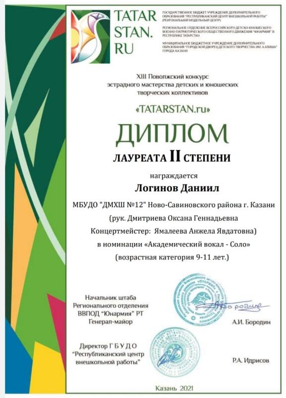 Логинова Даниила - Лауреата 2 степени (преподаватель Дмитриева О.Г., концертмейстер Ямалеева А.Я.) в номинации "Академический вокал - Соло", 9-11 лет