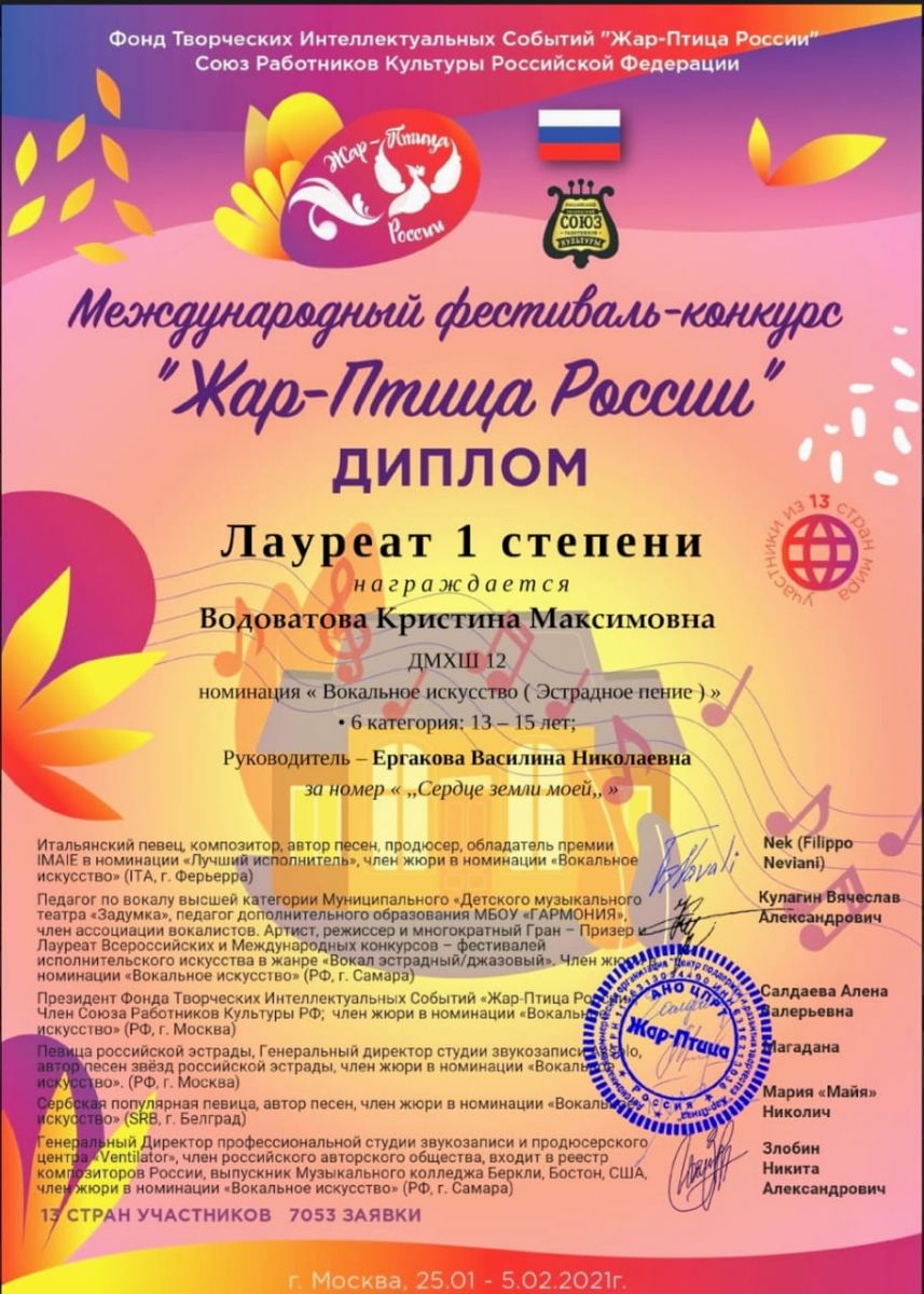 Поздравляем с успешным выступлением на Международном фестиваль-конкурсе "Жар-Птица России"