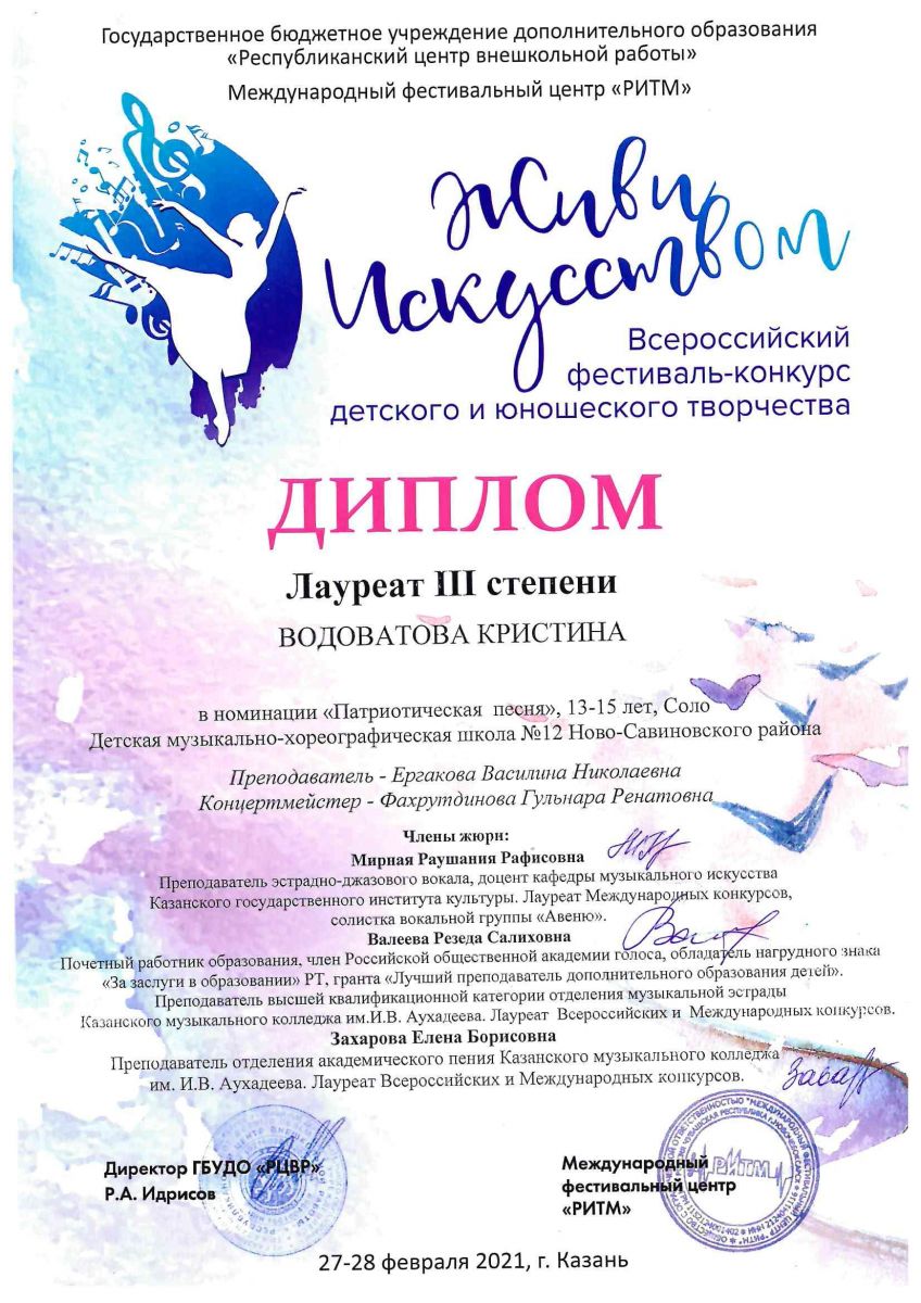 - Водоватову Кристину - Лауреата 3 степени (преподаватель Ергакова В.Н.)