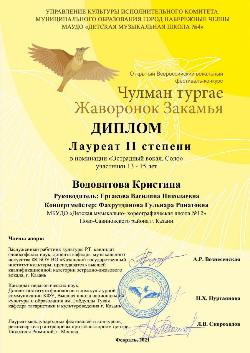- Водоватову Кристину - Лауреата 2 степени (преподаватель Ергакова В.Н.)