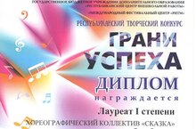 - Хореографический коллектив "Сказка" - Лауреатов 1 степени, в номинации "Народный танец", 10-12 лет. Преподаватель Солдатова Л.Г.