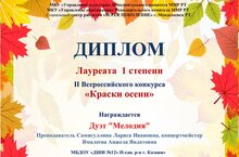 Поздравляем с успешным выступлением на II Всероссийском конкурсе "Краски осени" Лауреатов 1 степени Дуэт "Мелодия" в номинации "Вокальное и музыкальное искусство". Название работы "Музыка в природе". Преподаватель Самигуллина Л.И., концертмейстер Ямалеева А.Я.