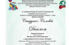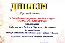 Поздравляем с успешным выступлением ученицу школы и хореографический коллектив "Искорка" - Лауреатов 2 степени, на 7 Международном конкурсе вокалистов народной артистки РФ и РТ, Лауреата государственной премии РТ им. Г. Тукая Винеры Ганеевой "Сандугач - Соловей". Номинация Народный вокал. Вокально-хореографический ансамбль. возрастная категория 7-9 лет. Желаем дальнейших успехов!