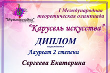 Поздравляем с успешным выступлением на 1 Международной теоретической олимпиаде "Карусель искусства" учащихся нашей школы. У нас 2 Диплома Лауреатов 2 степени и Диплом Лауреата 3 степени.