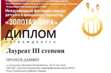 Поздравляем с успешным выступлением учащегося школы на Международном фестиваль-конкурсе детского и юношеского творчества "Золотая лира" - Лауреата 3 степени в номинации "Духовые инструменты" , 10-12 лет , соло. Желаем дальнейших успехов!