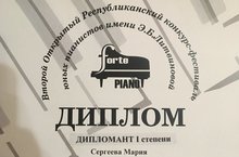 Поздравляем с успешным выступлением Сергееву Марию - Дипломанта 1 степени Второго Открытого Республиканского конкурса-фестиваля юных пианистов им. Э.Б.Литвиновой. Преподаватель Василевицкая Е.С. Желаем дальнейших успехов!