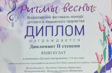 Поздравляем Яхина Булата - Дипломанта 2 степени Всероссийского фестиваль-конкурса детского и юношеского творчества "Ритмы весны" (преподаватель Вагапова Т.Б., концертмейстер Ямалеева А.Я.). Желаем дальнейших успехов!