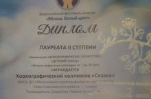 Поздравляем с успешным выступлением на Всероссийском фестиваль конкурсе "Яблонь белый цвет" Лауреата 2степени - Хореографический коллектив "Сказка" (руководитель Солдатова Л.Г.). Желаем дальнейших успехов!