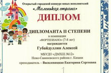 Губайдуллина Алексея - Дипломанта 2 степени Открытого городского конкурса юных исполнителей "Маленькая страна" (преподаватель Василевицкая Е.С.)