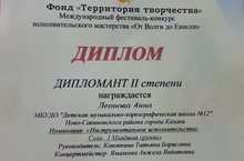 Леонову Анну - Дипломанта 2 степени Международного фестиваль-конкурса исполнительского мастерства "От Волги до Енисея" (преподаватель Коковкина Т.Б., концертмейстер Ямалеева А.Я.). Желаем дальнейших успехов!