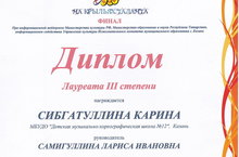 Сибгатуллину Карину (преп. Самигуллина Л.И.) - Лауреата 3 степени Международного конкурса - фестиваля в рамках проекта "На крыльях таланта". Желаем дальнейших успехов!
