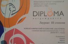 Лауреатов 3 степени хореографический коллектив "Ласточки" (руководитель Егорова М.И.) 3 Международного фестиваль-конкурса детского и юношеского творчества "Золотая лира". Желаем дальнейших успехов!
