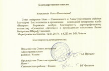 Совет ветеранов Авиастроительного и Ново-Савиновского районов благодарит директора школы Ольгу Николаевну Мартынову, хореографический коллектив "Созвездие "Детство"" и руководителя коллектива Лилию Валерьевну Шарафутдинову за помощь в организации новогодней программы клуба "Ветеран". Мероприятие состоялось 12.01.2017г. в КДК им. В.И.Ленина.