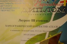 Хореографический коллектив "Сказка" (руководитель Солдатова Л.Г.) - Лауреатов 3 степени Межрегиональный фестиваль детского и юношеского творчества "Вдохновение". Желаем дальнейших успехов!