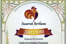 Лауреата 3 степени Сибгутуллину Карину (преподаватель Самигуллина Л.И.) Открытого регионального конкурса детского творчества "Золотой Петушок". Желаем дальнейших успехов!