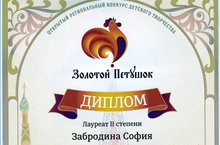 Лауреата 2 степени Забродину Софию (преподаватель Самигуллина Л.И.) Открытого регионального конкурса детского творчества "Золотой Петушок". Желаем дальнейших успехов.