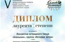 ПОЗДРАВЛЯЕМ ХОРЕОГРАФИЧЕСКИЙ КОЛЛЕКТИВ "АПЕЛЬСИН" ГРУППА "ИСТОРИЯ ВЕТРА" ( РУК. ТУРЦЕВА ТАТЬЯНА АЛЕКСАНДРОВНА) - ЛАУРЕАТОВ I СТЕПЕНИ V СУПЕРФИНАЛА МЕЖДУНАРОДНОГО ПРОЕКТА "САЛЮТ ТАЛАНТОВ" ХОРЕОГРАФИЯ И ТЕАТР. Г.САНКТ-ПЕТЕРБУРГ. РОССИЯ.