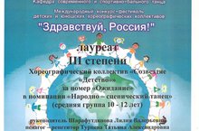 Хореографический коллектив "Созвездие "Детство"" (преподаватель Шарафутдинова Л.В., педагог-репетитор Турцева Т.А.) - Лауреатов 3 степени на Международном конкурсе-фестивале детских и юношеских хореографических коллективов "Здравствуй, Россия!"