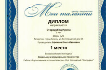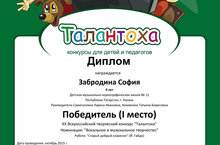 Поздравляем Забродину Софию (преп. Самигуллина Л.И., Коковкина Т.Б.) за I место на XX Всероссийском творческом конкурсе "Талантоха" в номинации "Вокальное и музыкальное творчество".