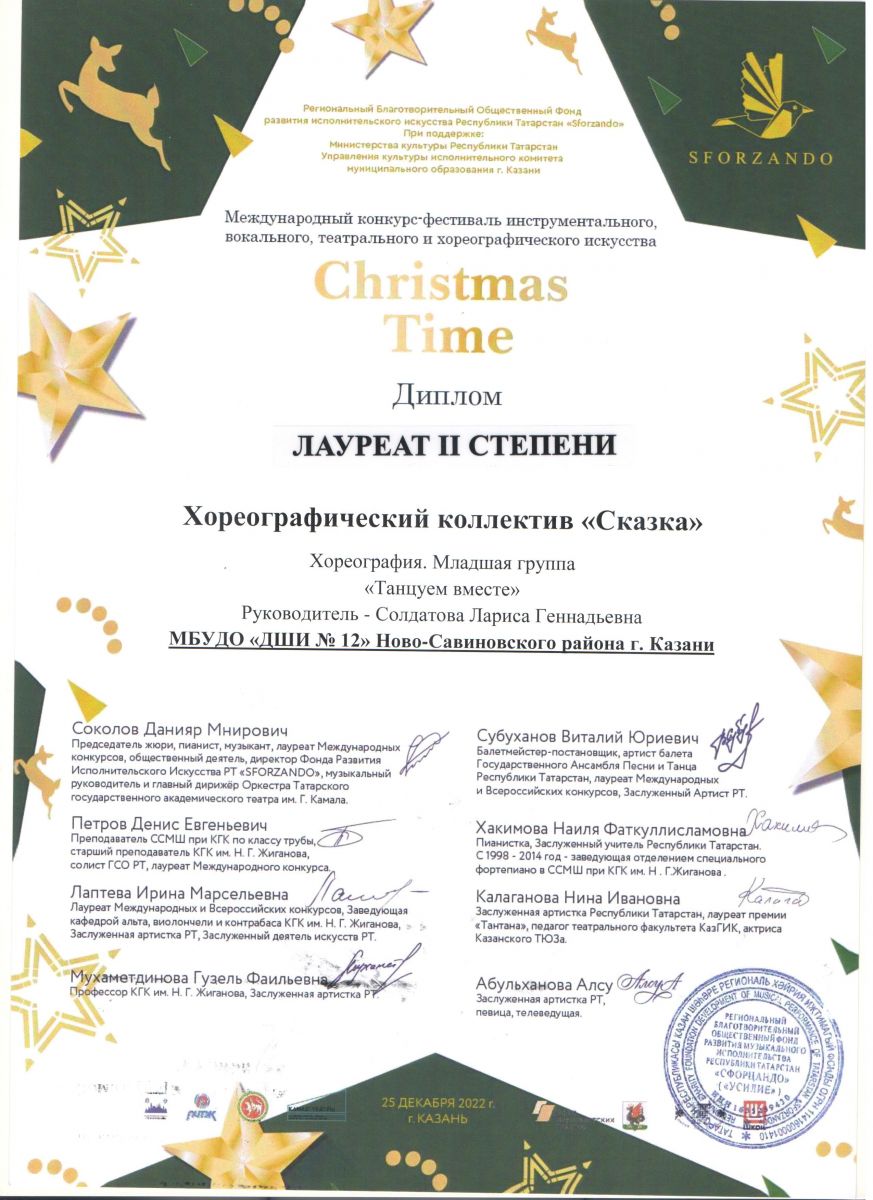 - Хореографический коллектив "Сказка" - Лауреатов 2 степени (преподаватель Солдатова Л.Г.), Номинация: Хореография. Возрастная категория: Младшая группа.