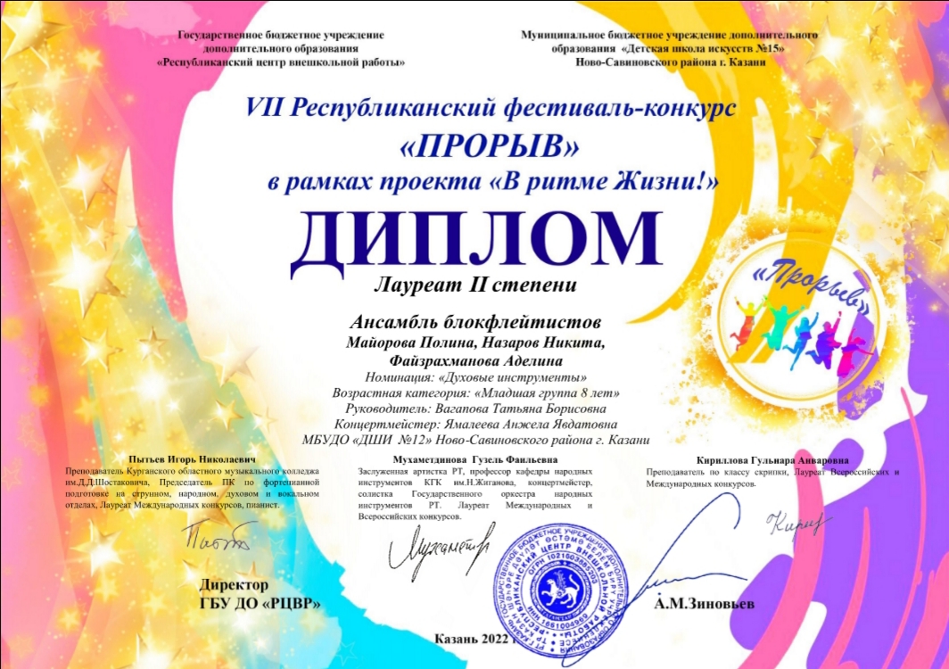 - Ансамбль блокфлейтистов (Майорову Полину, Назарова Никиту, Файзрахманову Аделину) - Лауреатов 2 степени (преподаватель Вагапова Т.Б., концертмейстер Ямалеева А.Я.). Номинация: "Духовые инструменты". Возрастная категория: "Младшая группа 8 лет".