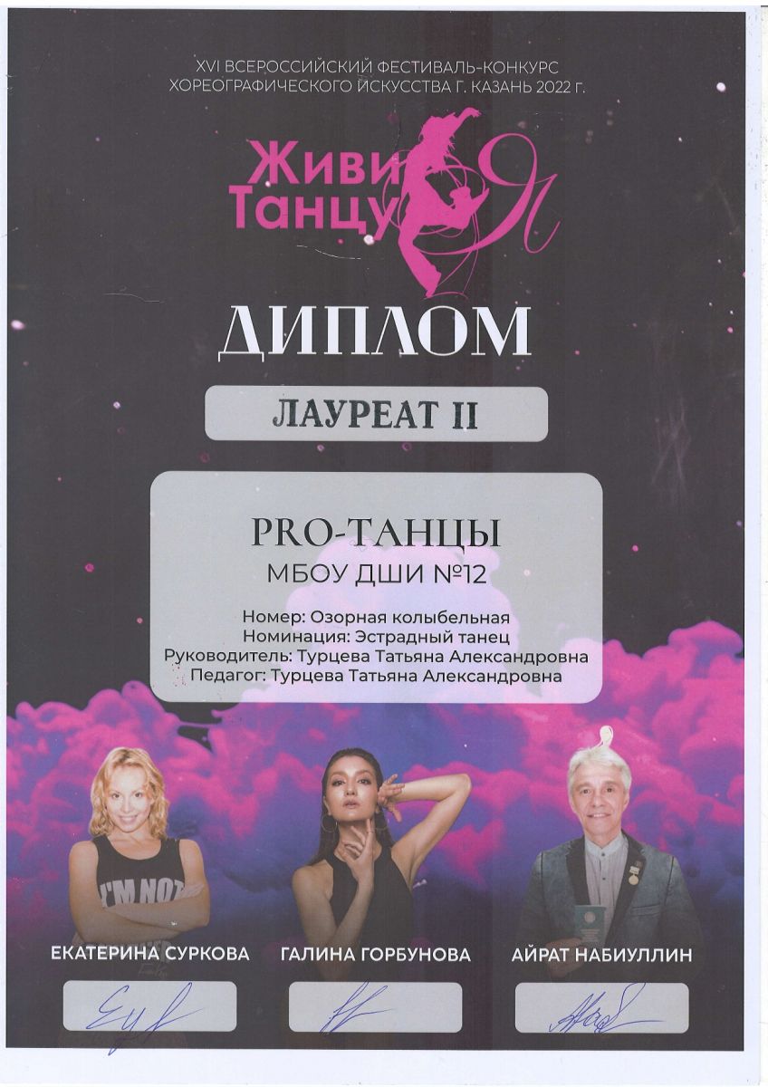 - Хореографический коллектив " Pro - танцы" - Лауреатов 2 степени (преподаватель Турцева Т.А.). Номинация "Эстрадный танец". Возрастная категория 7-9 лет.
